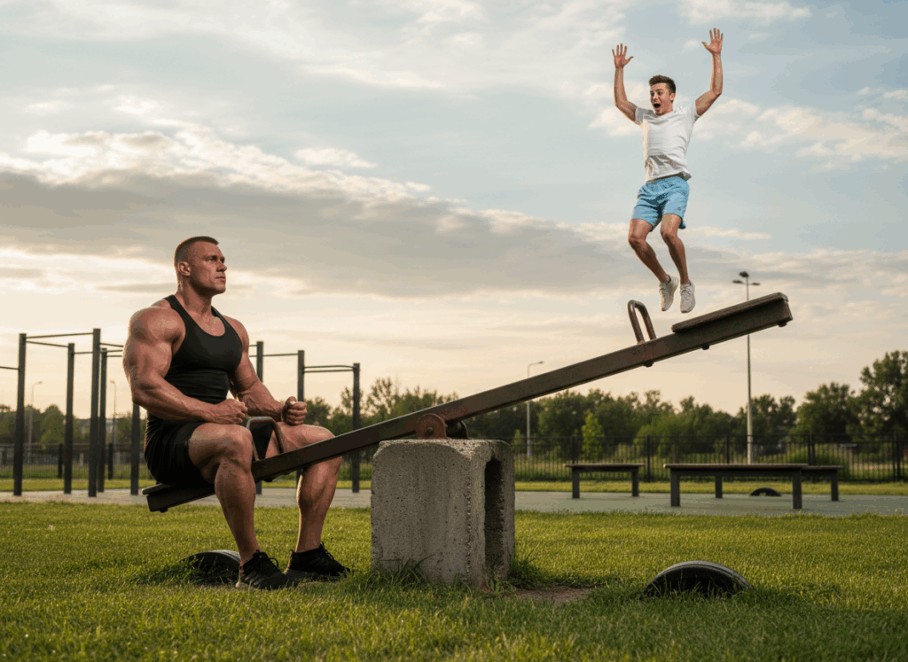 The first major disadvantage – lack of skill. Skill manages the mechanical factors (momentum, levers, elasticity, balance) which make force expression possible. Size, strength and aerobic fitness cannot compensate for mechanical ignorance. Facing novel activities, fit people generally outcompete the unfit. This generalization vanishes when the unfit are replaced by individuals with experience and skill.